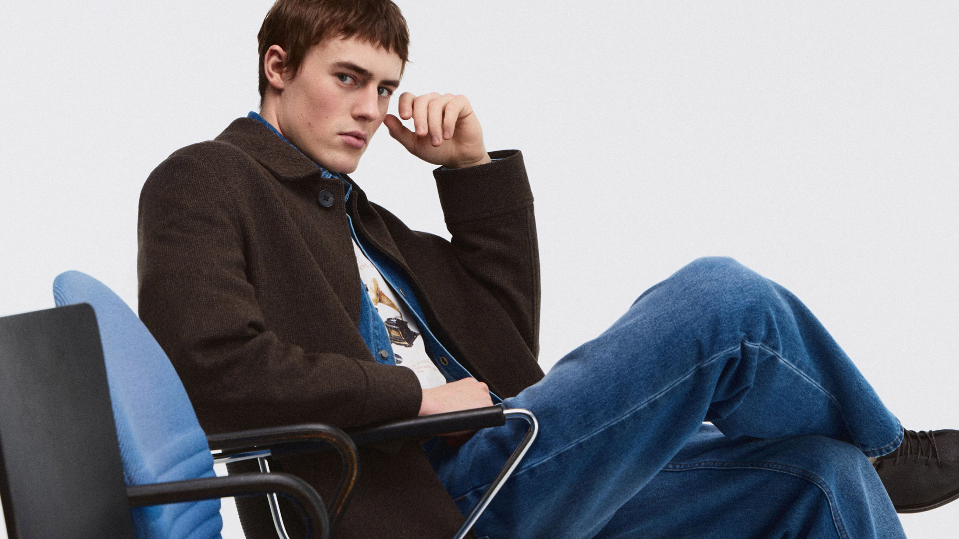 Капсула выполнена преимущественно в синих и коричневых оттенках и дополнена разными принтами — текстовыми, в полоску и клетку.